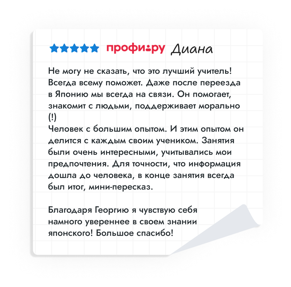 «В Японию поехала впервые, но незнакомая страна не пугала и не было страха разочароваться, потому что изначально знала, куда еду. Больше всего понравилась самостоятельность и возможность выбо-ра: не ощущалось такого ограничения, как на многих экскурсионных поездках, где все расписано по минутам! Плюс Георгий рассказывал нам, как чем правильно пользоваться, как докуда добраться, и вот была во многих вещах поддержка, что не могу не радовать:)